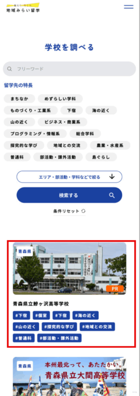本PR枠は、地域みらい留学公式Webサイトにある「学校を調べる」ページへアクセスした際に、画面上部に優先表示される特別な広告スペースを指します。