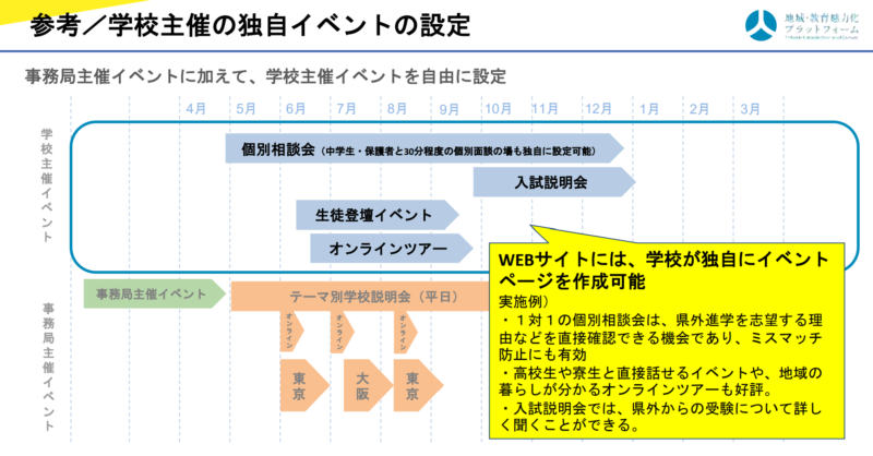 イベント参加者へ多くの情報を発信するため、また検討する上での疑問・不安点を解消するための対話の場として学校独自で主催するイベント(学校主催イベント)も開催しましょう。